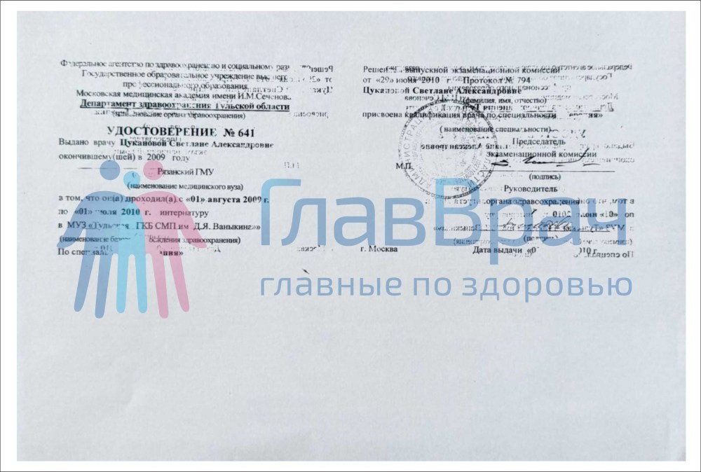 Интернатура по специальности «Терапия» на базе МУЗ «Тульская ГКБ СМП им Д.Я. Ваныкина»»