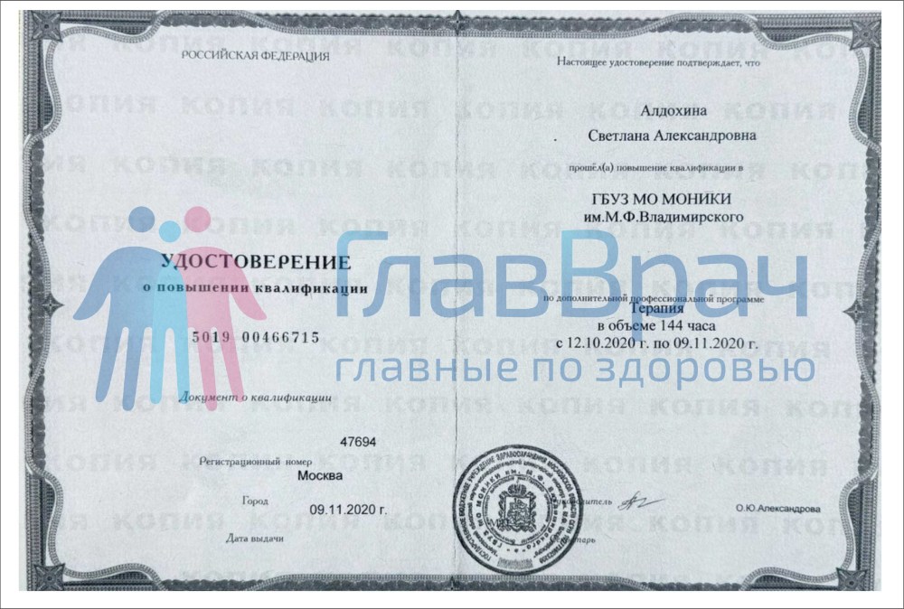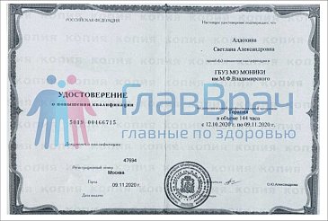 Удостоверение о повышении квалификации. ГБУЗ МО МОНИКИ им. М.Ф. Владимирского