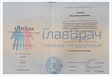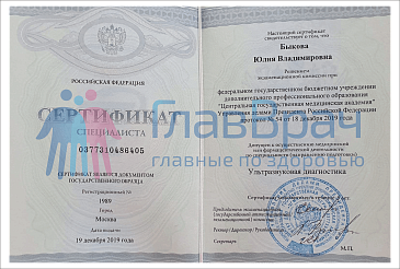 Сертификат. Федеральном государственном бюджетном учреждении дополнительного профессионального образования "Центральная государственная медицинская академия" Управления делами Президента Российской Федерации. Ультразвуковая диагностика.
