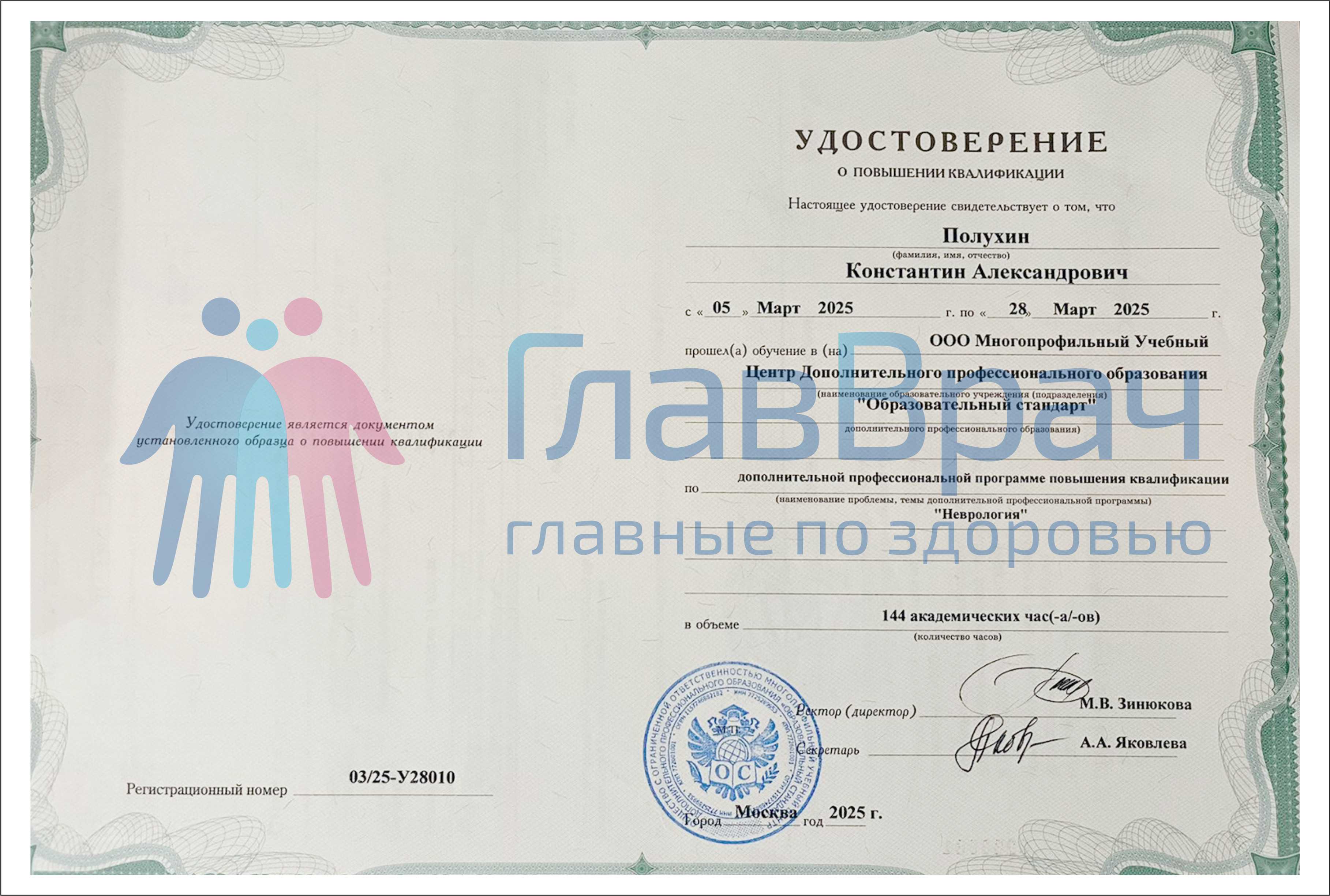 Российский национальный исследовательский медицинский университет имени Н.И. Пирогова. Специализация: «Неврология»