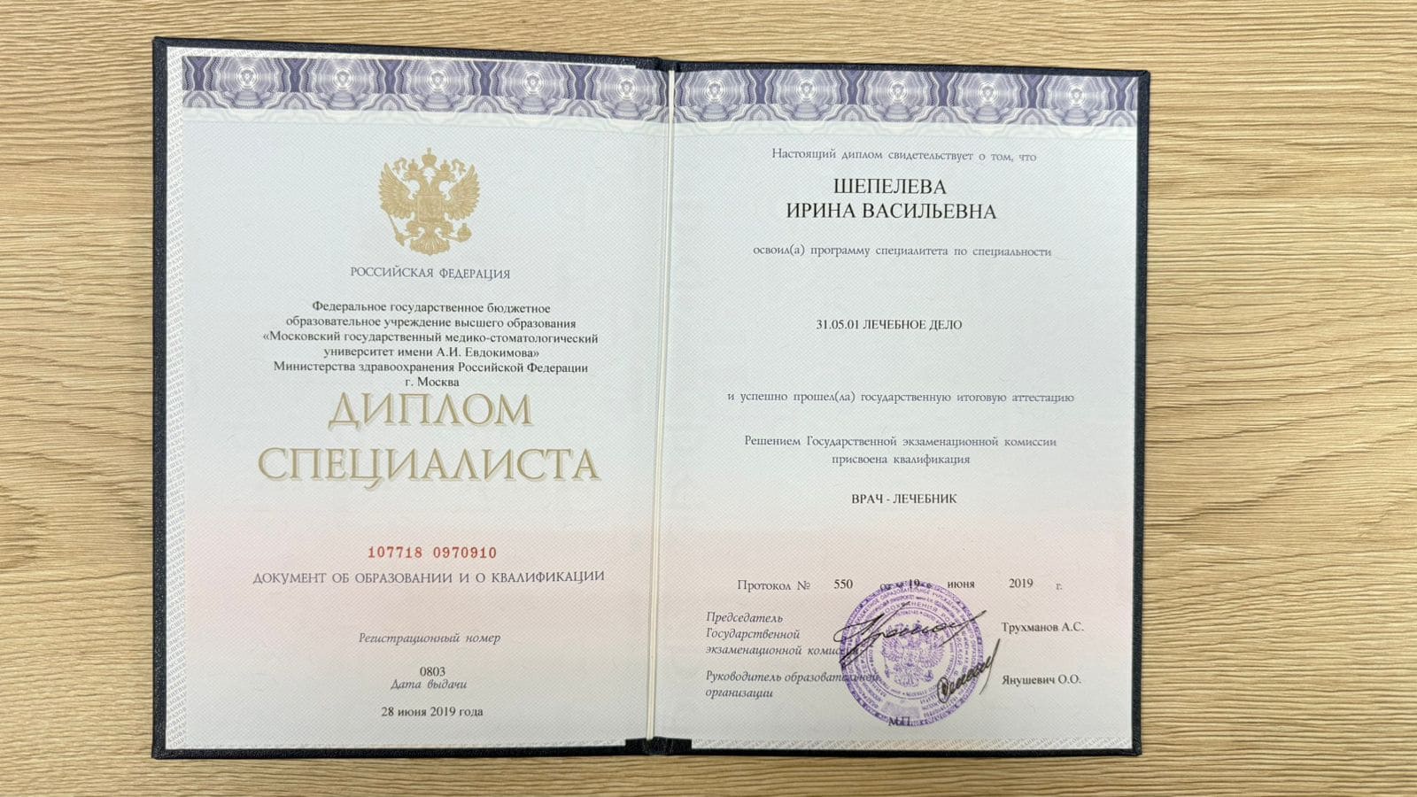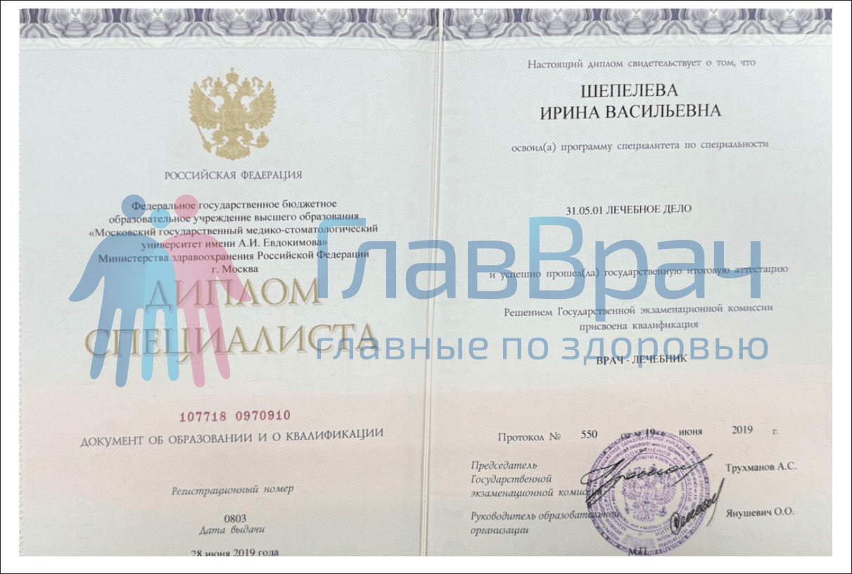 Диплом по специальности "Лечебное дело", Московский государственный медико- стоматологический университет им. А.И.Евдокимова