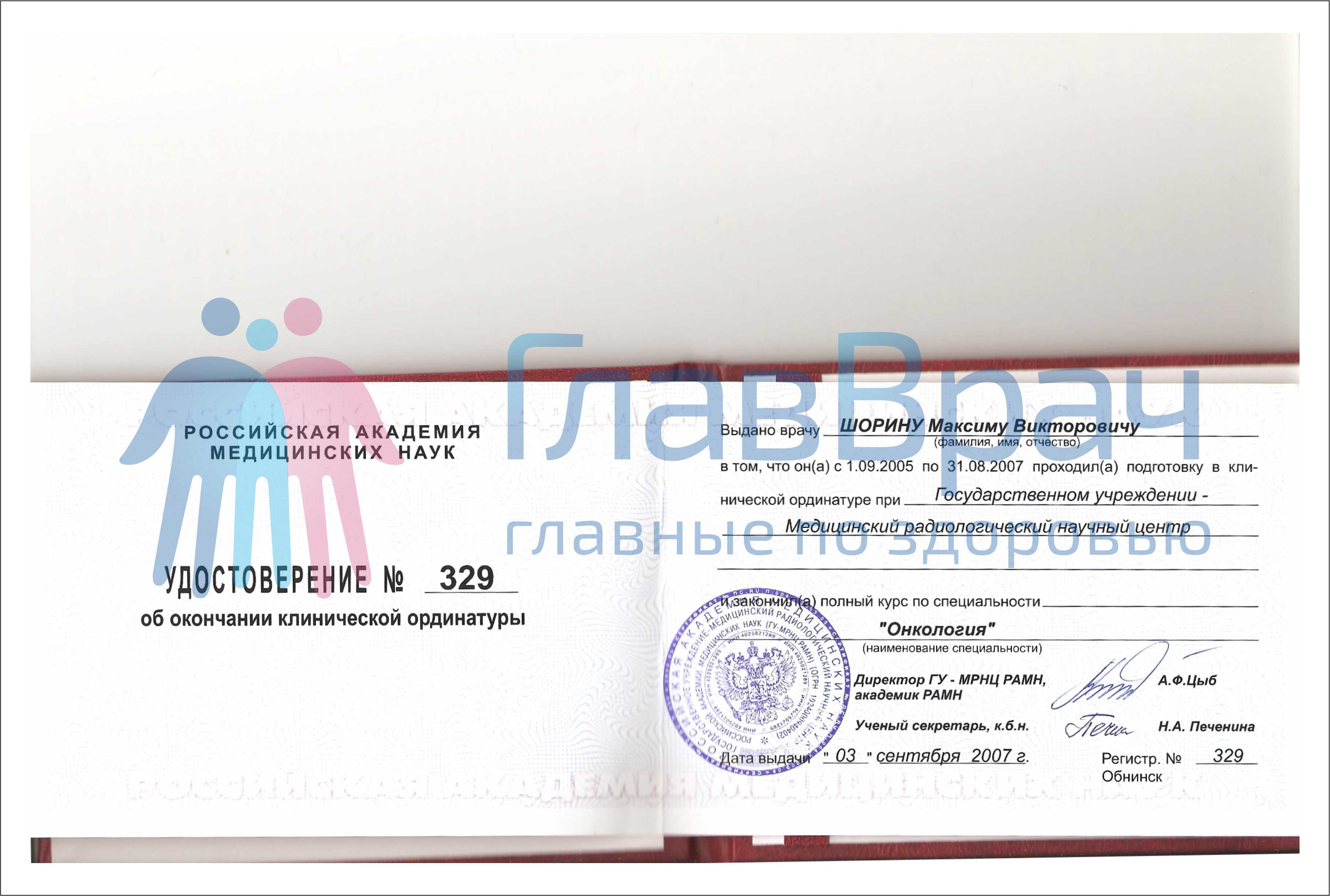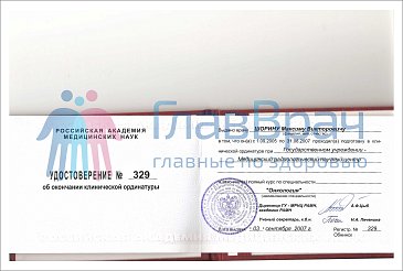 Удостоверение об окончании клинической ординатуры ГУ МРНЦ РАМН(г.Обнинск)