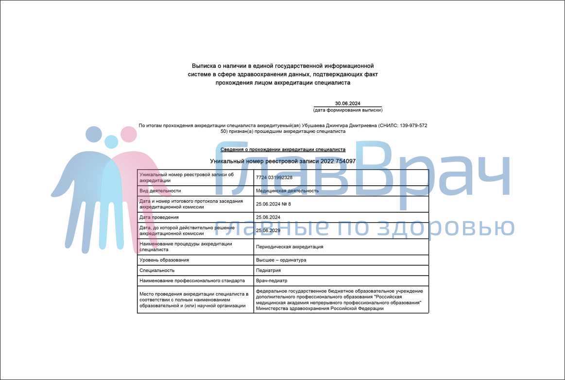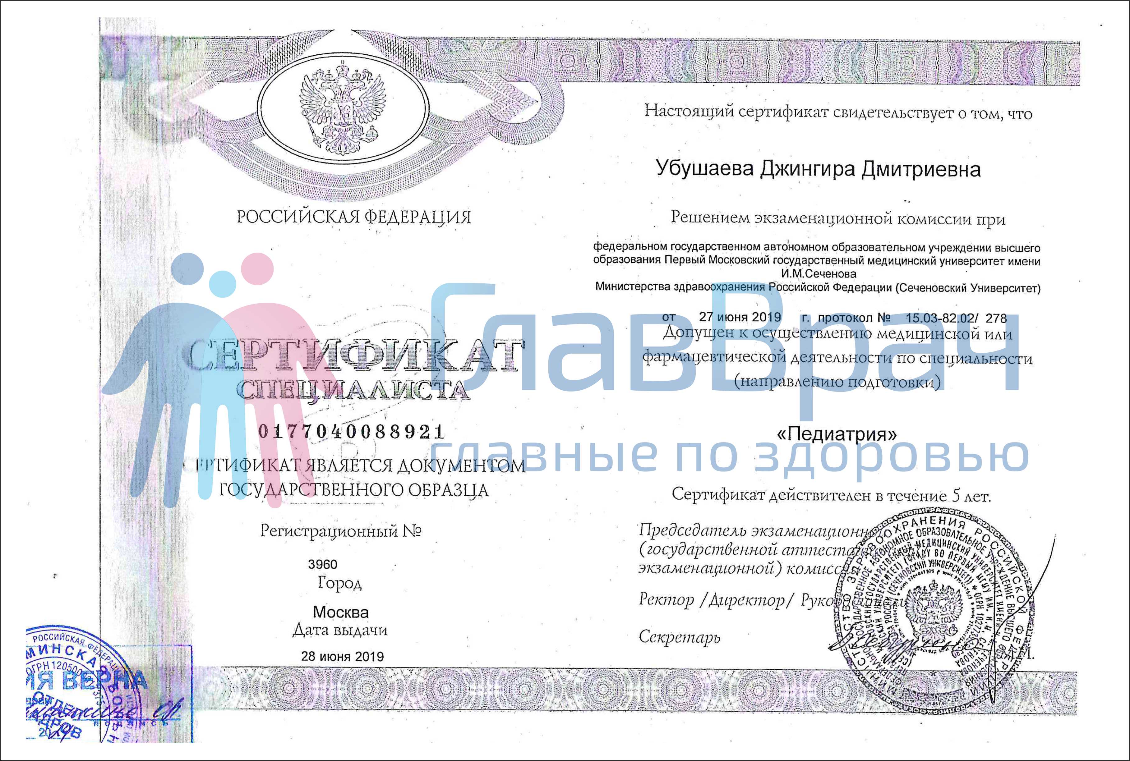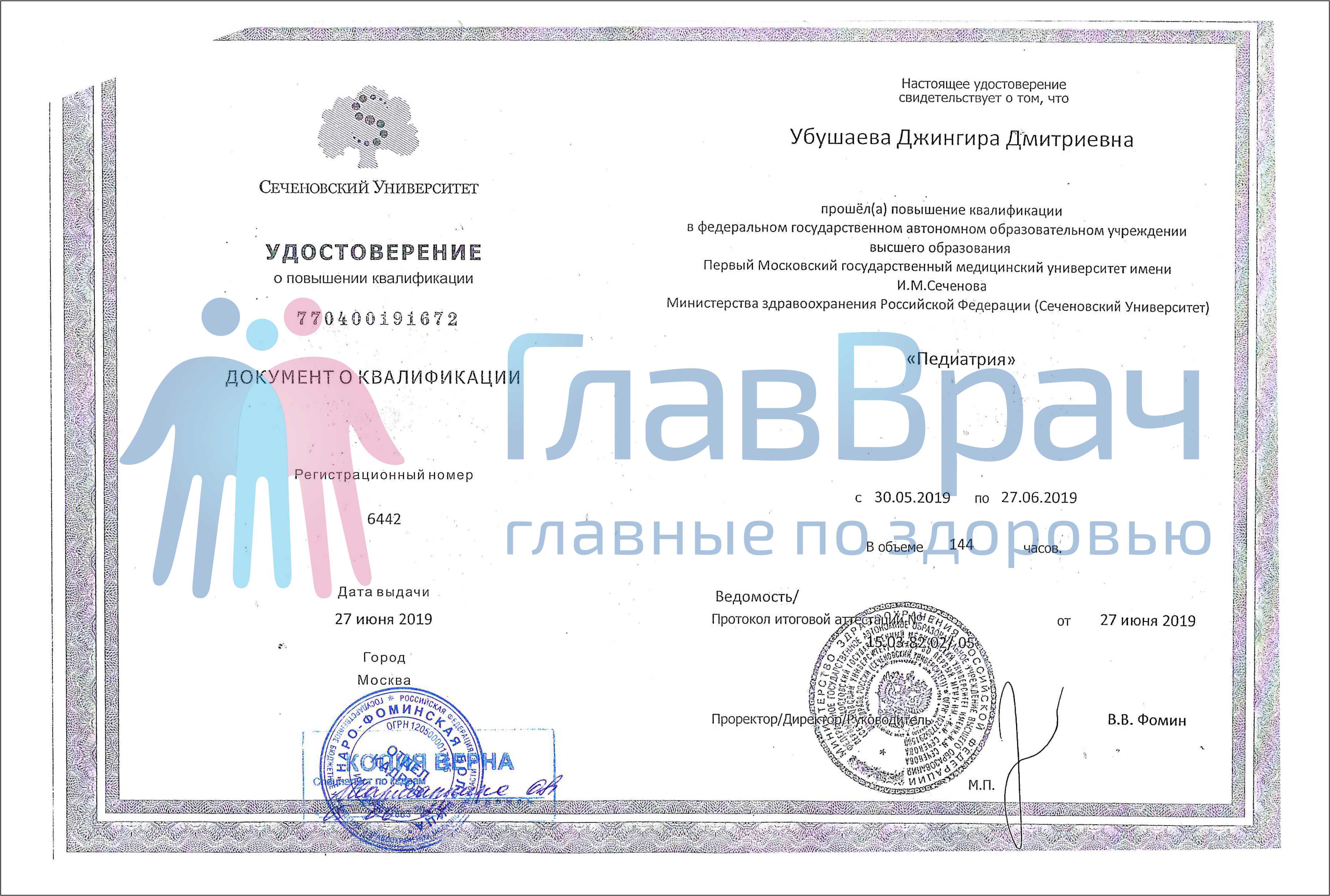 Сертификат о повышении квалификации по педиатрии. Первый Московский государственный медицинский университет имени И.М Сеченова.