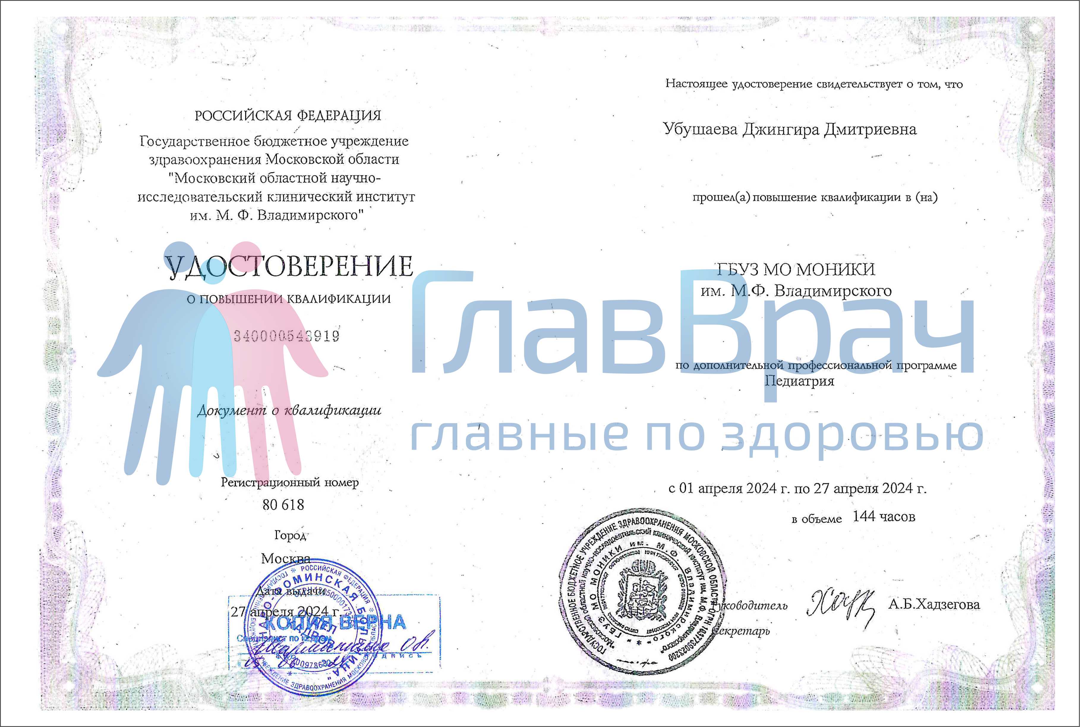 Сертификат по педиатрии ГБУЗ МО МОНИКИ им.Н.Ф.Владимирского