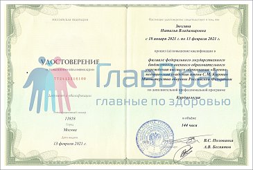 Диплом Кардиолог. Государственный институт усовершенствования врачей, Министерства обороны Российской Федерации.